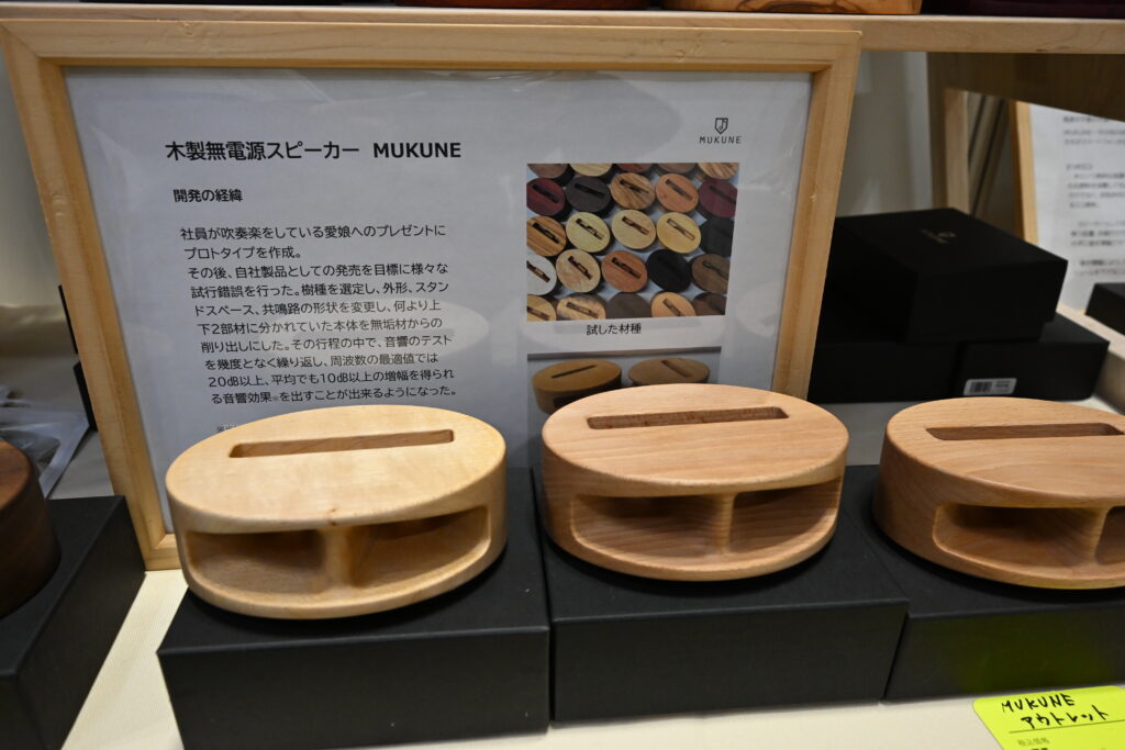 そんな展示会で、素材の特性と精密加工技術を極限まで活かした、非常に興味深いブースに立ち寄りました。今回ご紹介したいのは、株式会社ウッド・マイスター(https://wood-meisters.com/)による木製無電源スピーカー「MUKUNE(ムクネ)」です。